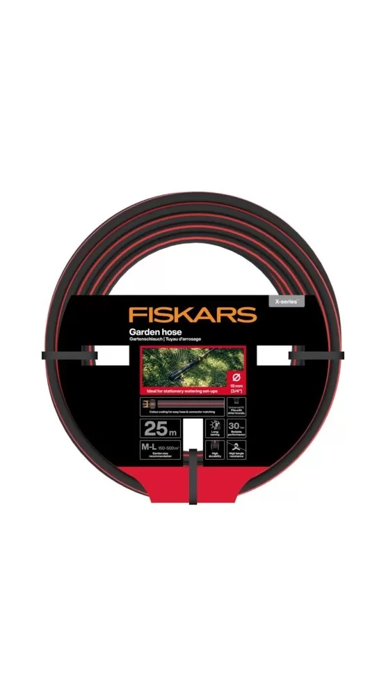 • Zahradní hadice Fiskars řady X-series 19 mm (3/4") je vysoce kvalitní, odolná zahradní hadice navržená pro snadné používání