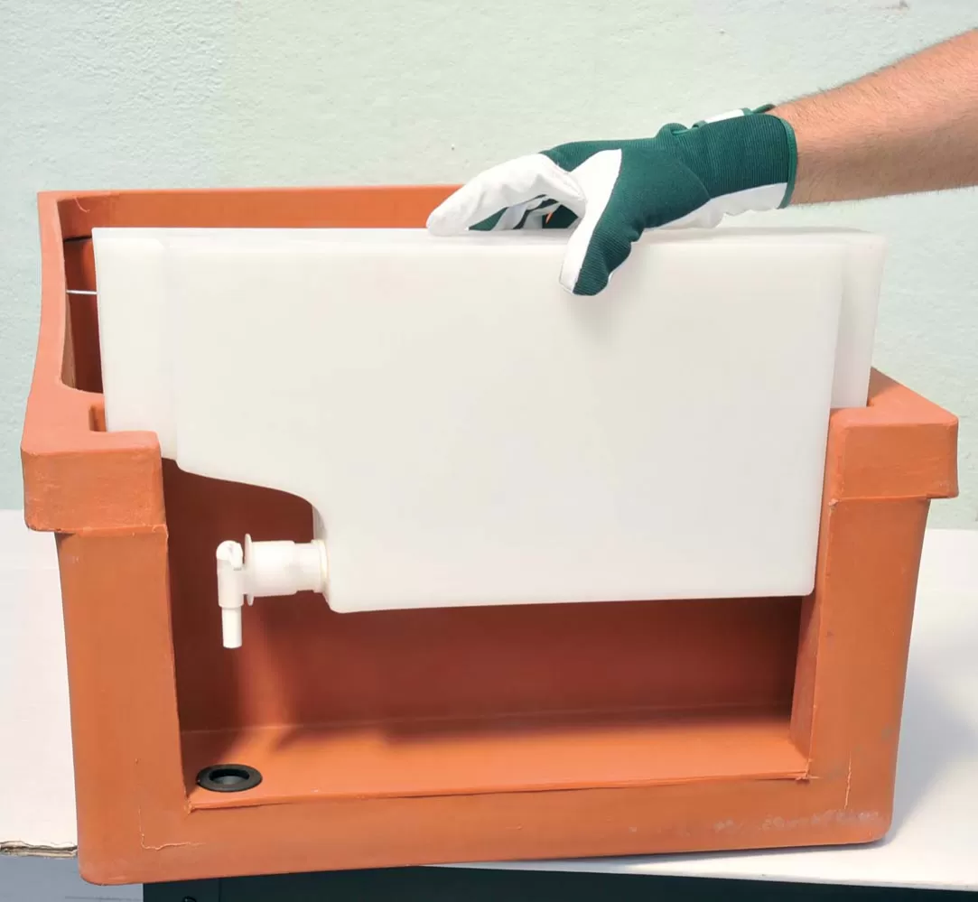 Samozavlažovací truhlík pro městskou zahradu - součástí je 6litrová nádrž na vodu s kohoutkem, kapilární netkaná textilie o rozměrech 80 x 130 cm a pytel expandované hlíny. Truhlík může obsahovat až 100 litrů zeminy.