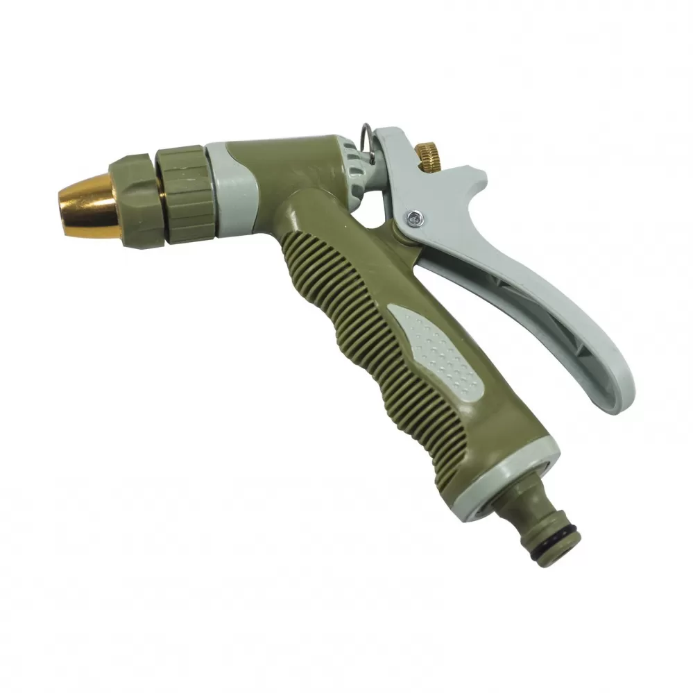 Hadicový postřikovač s pogumovanými prvky proti prokluzu. možnost regulace průtoku vody a aretace spouště.