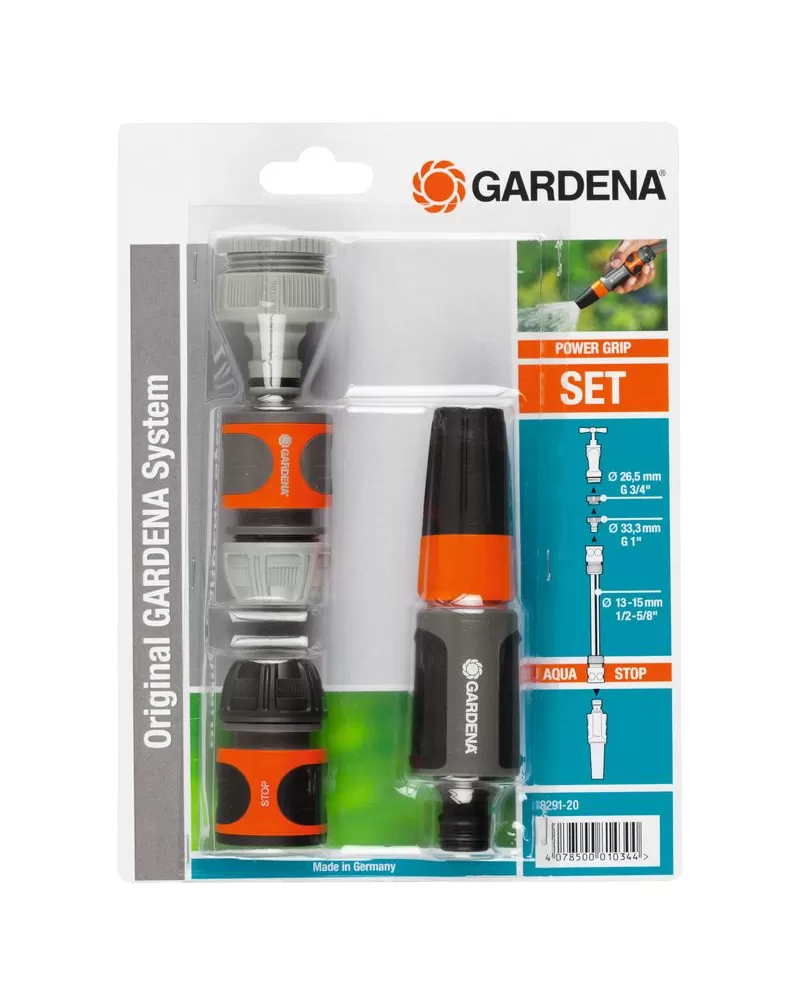 • GARDENA základní vybavení obsahuje šroubení pro vodovodní kohoutek se závitem s adaptérem (č.v. 18202 a 5305), rychlospojku (č.v. 18215), stopspojku (č.v. 18213) a čisticí postřikovač (č.v. 18300).